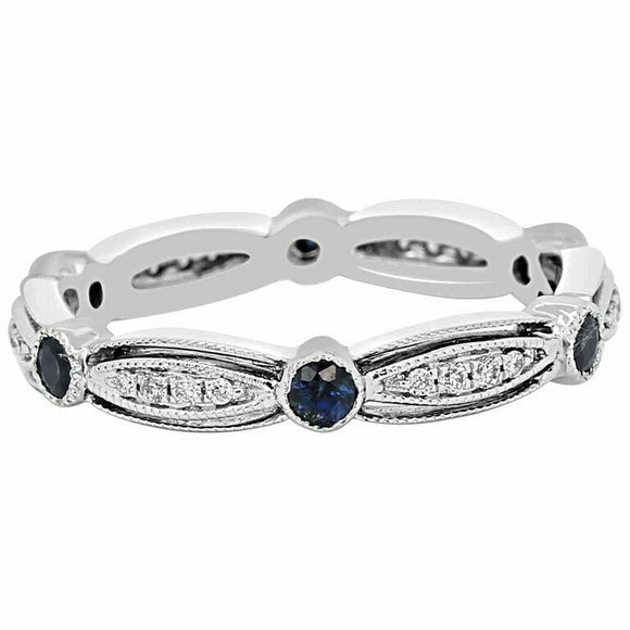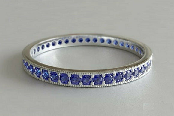 1ct Round Cut Blue Sapphire Milgrain Vintage Eternity Band 14k White Gold Finish