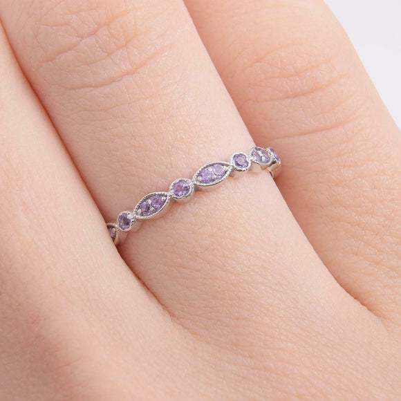 1ct Round Cut Purple Amethyst Wedding Band Milgrain Eternity 14k White Gold Over