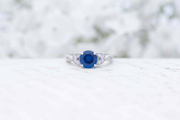 1ct Round Blue Sapphire Engagement Ring Leaf Vintage Milgrain 14k WhiteGold Over