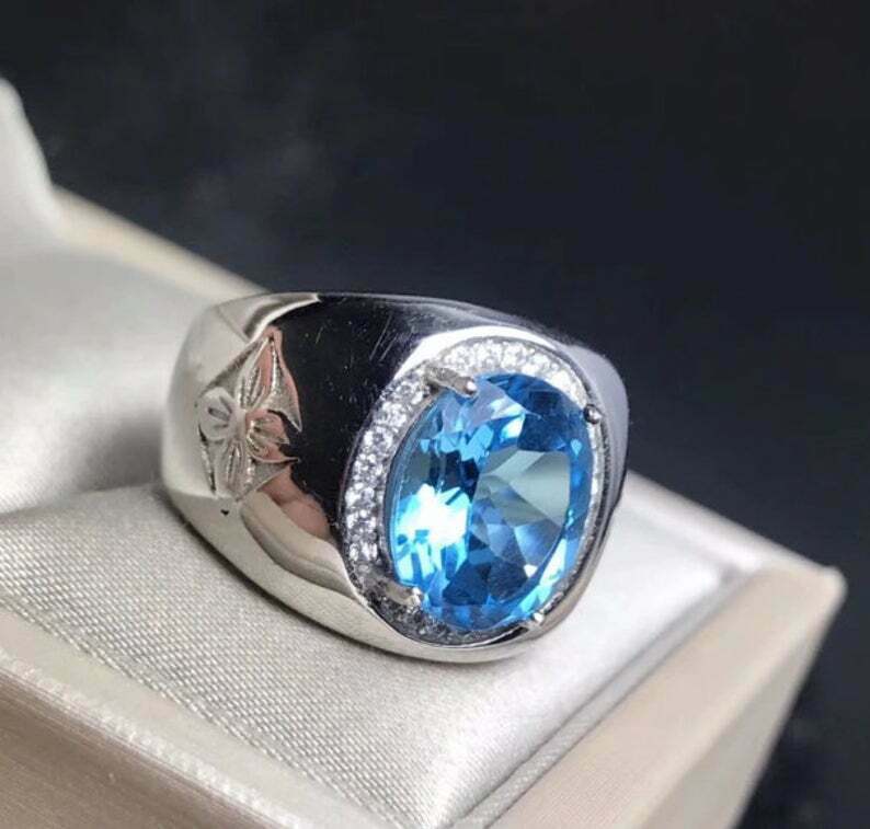 2ct Oval Cut Blue Topaz Signet Halo Men Engagement Ring 14k White Gold Finish