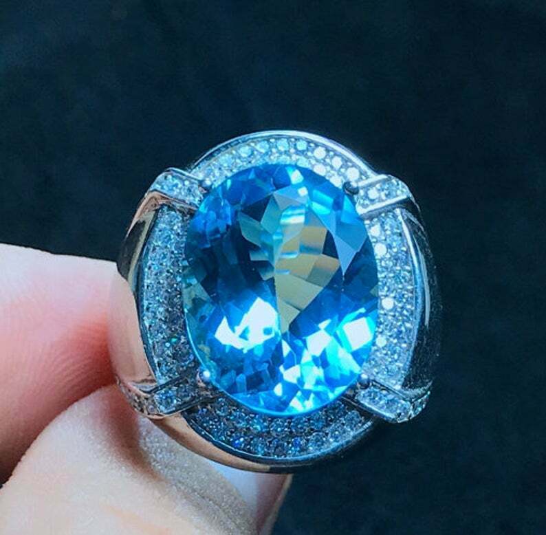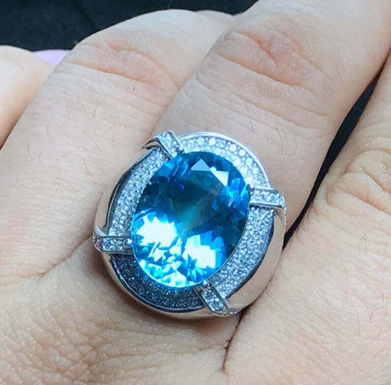 3.45ct Oval Cut Blue Topaz Halo Signet Engagement Men Ring 14k White Gold Finish