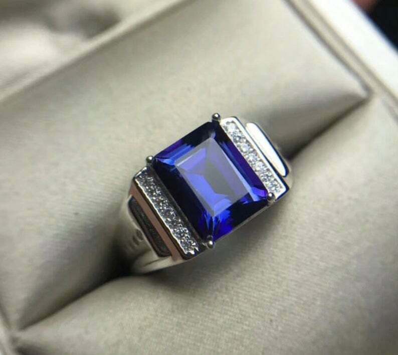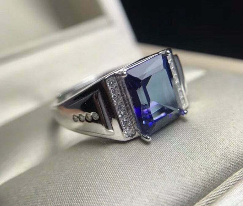 3ct Emerald Cut Blue Sapphire Signet Engagement Men Ring 14k White Gold Finish