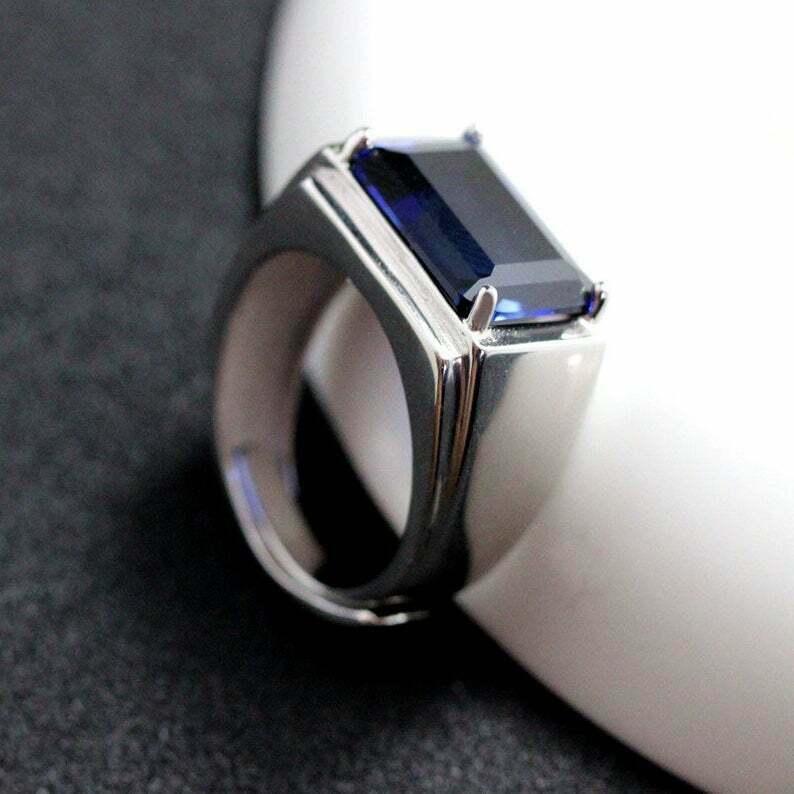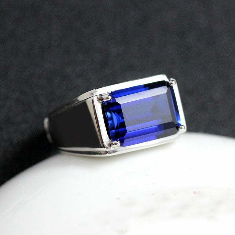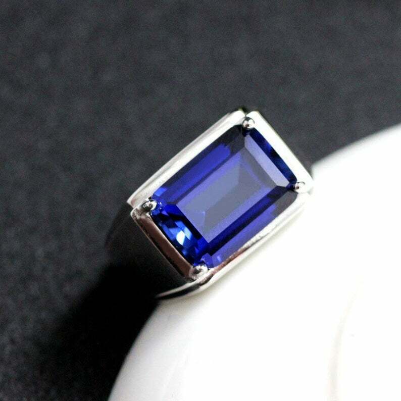 4ct Emerald Cut Blue Sapphire Solitaire Mens Engagement Ring 14k White Gold Over
