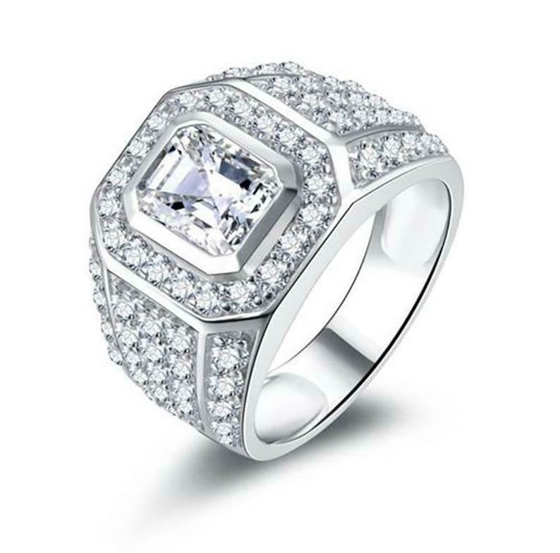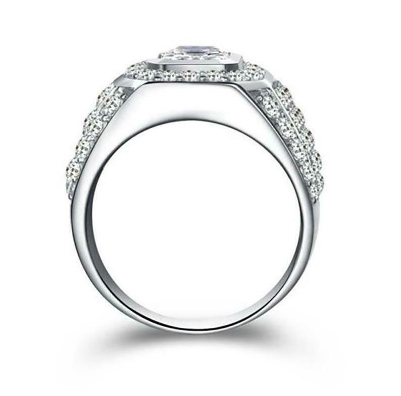 5ct Emerald Cut Diamond Iced Cluster Halo Mens Engagement Ring 14k White Gold Finish