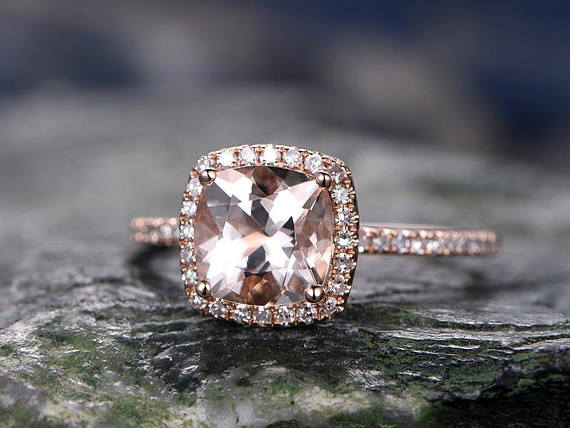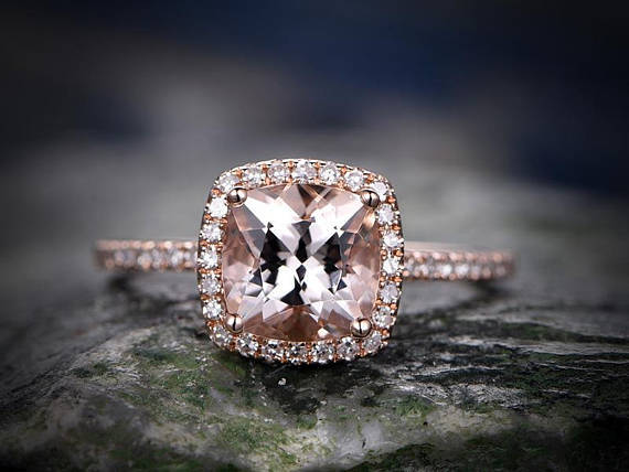 1.4ct Cushion Cut Morganite Engagement Ring Diamond Halo 14k Rose Gold Finish