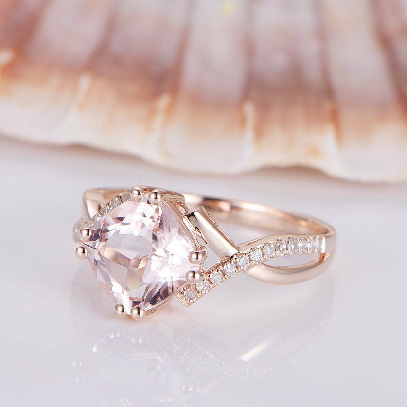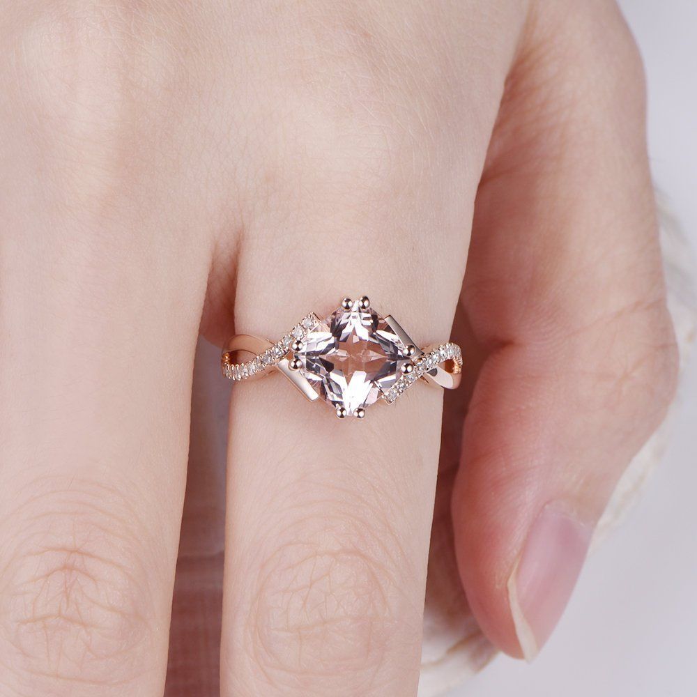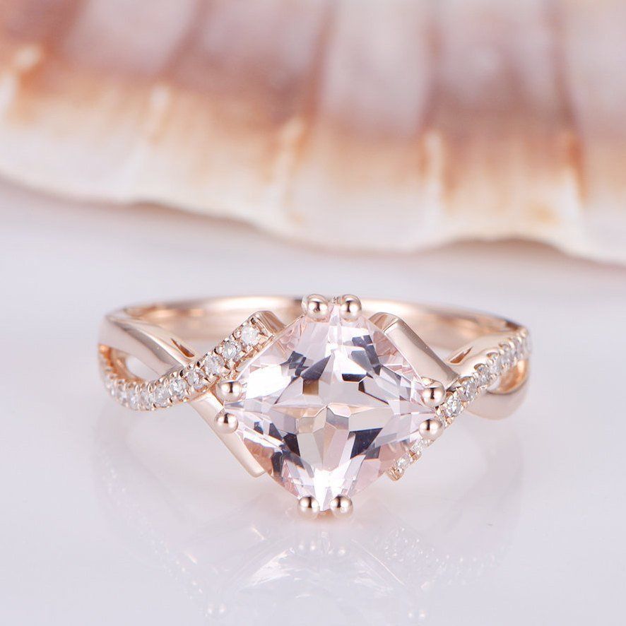 1.5ct Cushion Peach Morganite Twisted Shank Engagement Ring 14k Rose Gold Finish