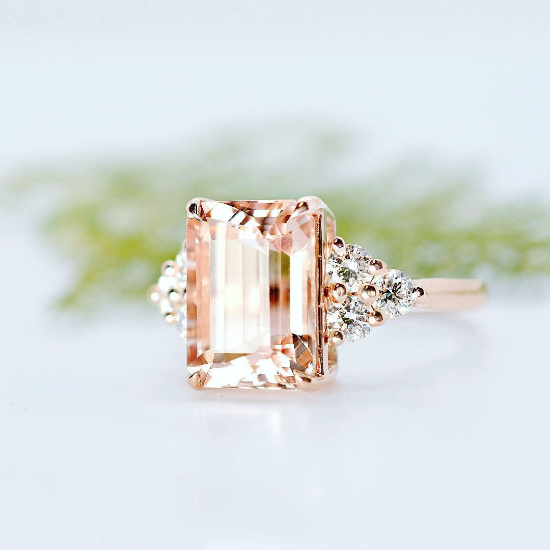 1.5ct Emerald Cut Peach Morganite Diamond Engagement Ring 14k Rose Gold Finish