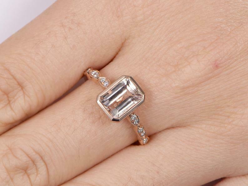 1.5ct Emerald Cut Peach Morganite Engagement Ring Bezel Set 14k Rose Gold Finish