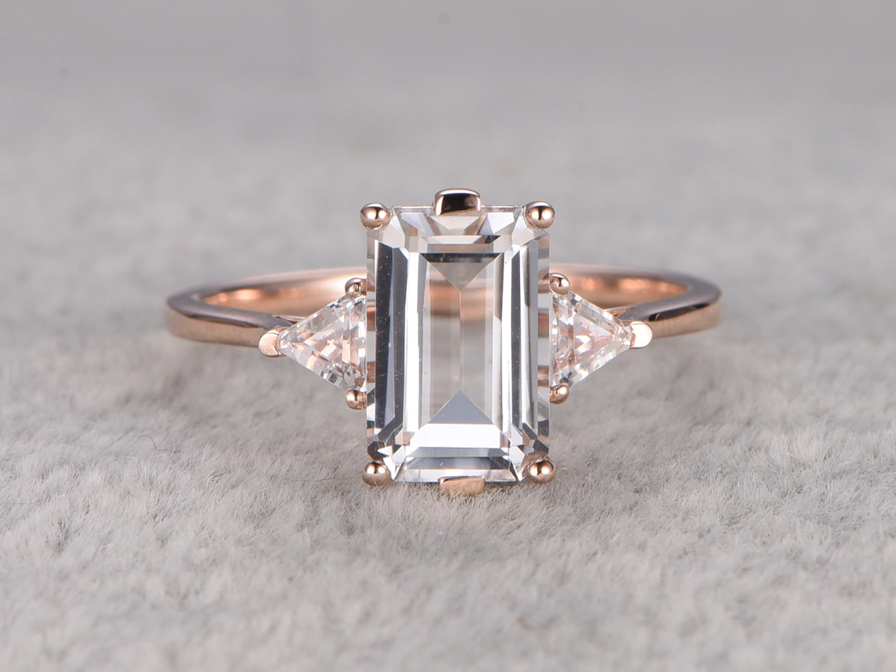 1.5ct Emerald Cut Peach Morganite Engagement Ring Trilogy 14k Rose Gold Finish