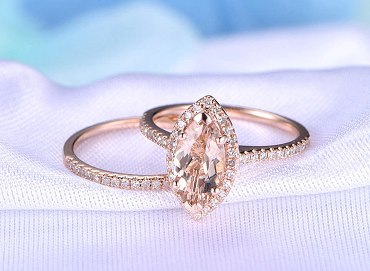 1.5ct Engagement Ring Marquise Cut Peach Morganite Bridal Set 14k Rose Gold Over