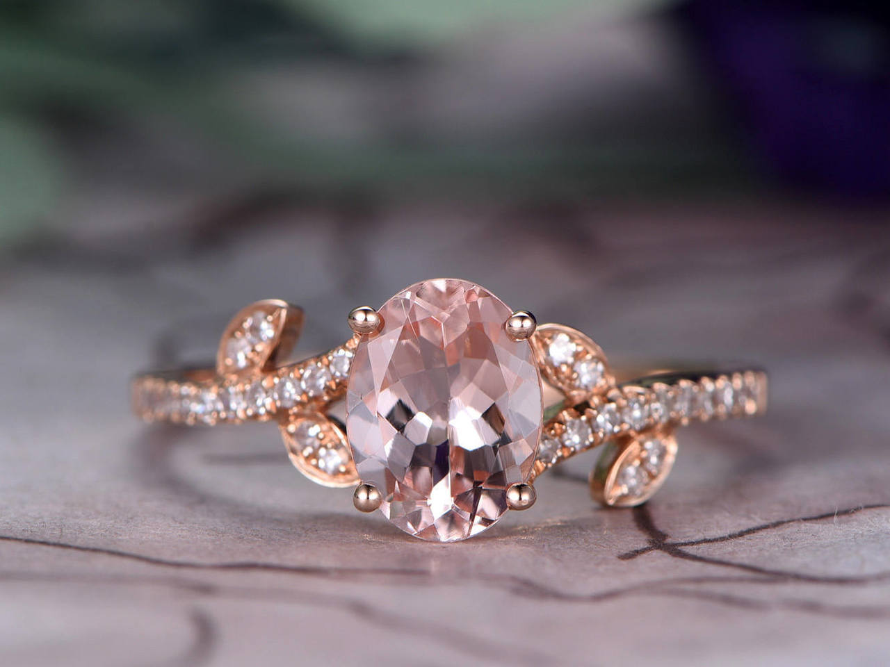 1.5ct Oval Cut Morganite Engagement Ring Diamond Leaf Accent 14k Rose Gold Over