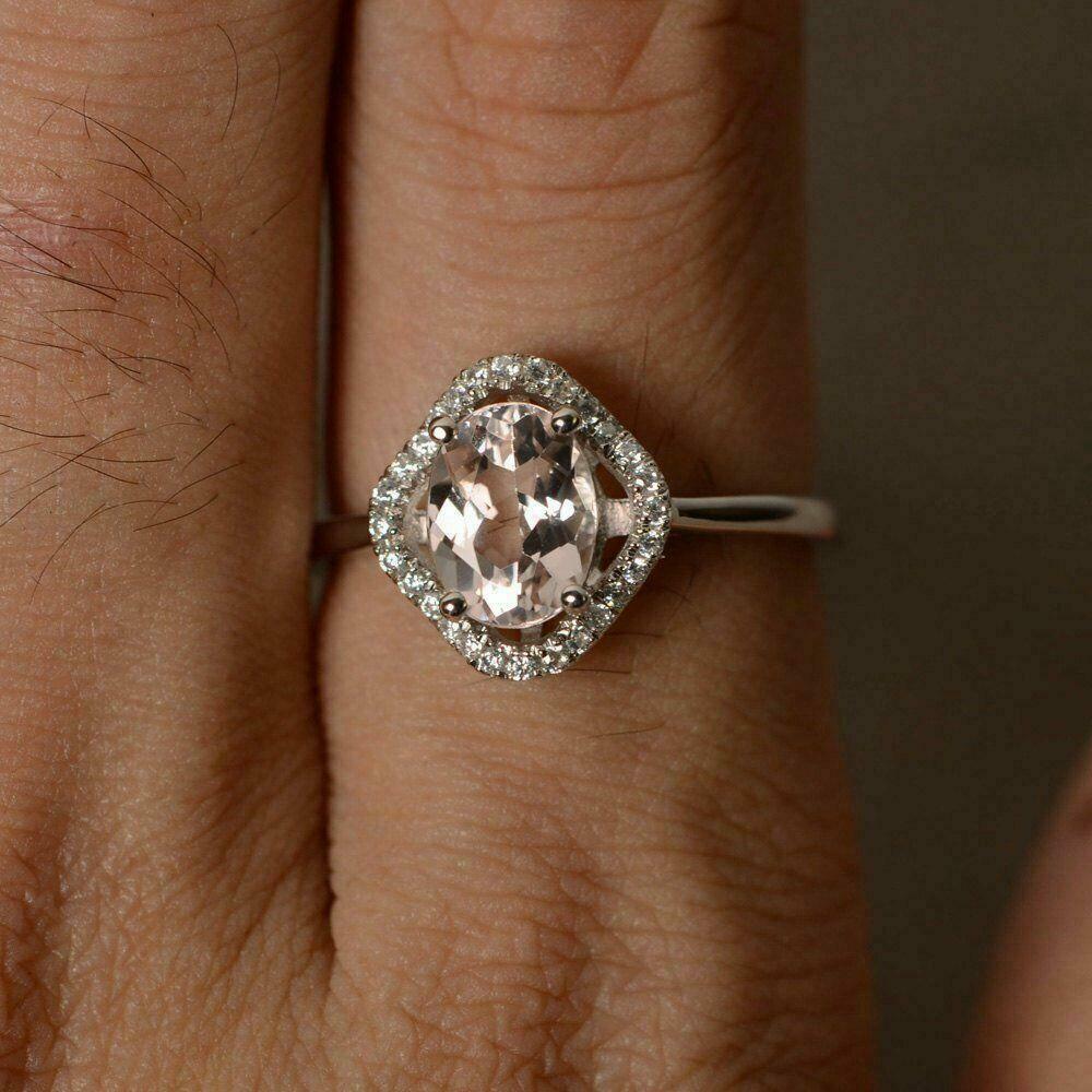 1.5ct Oval Cut Peach Morganite Engagement Ring 14k WhiteGold Over Halo Solitaire