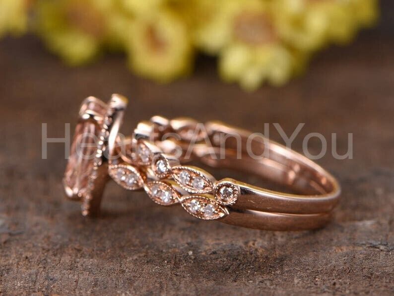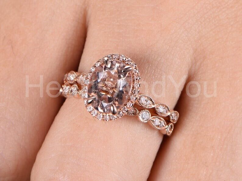 1.5ct Oval Cut Simulated Peach Morganite Halo Bridal Set 14k Rose Gold Plated