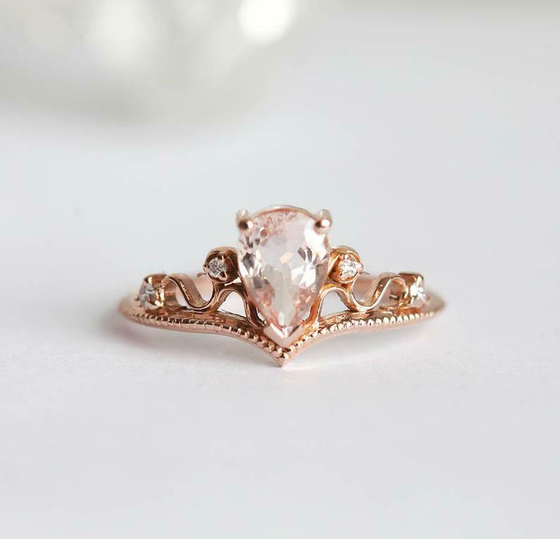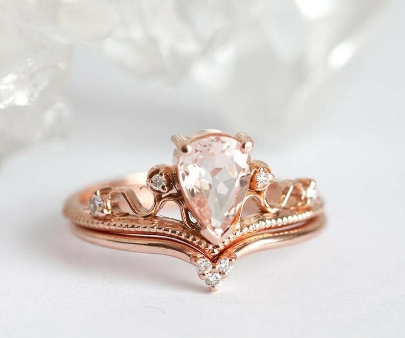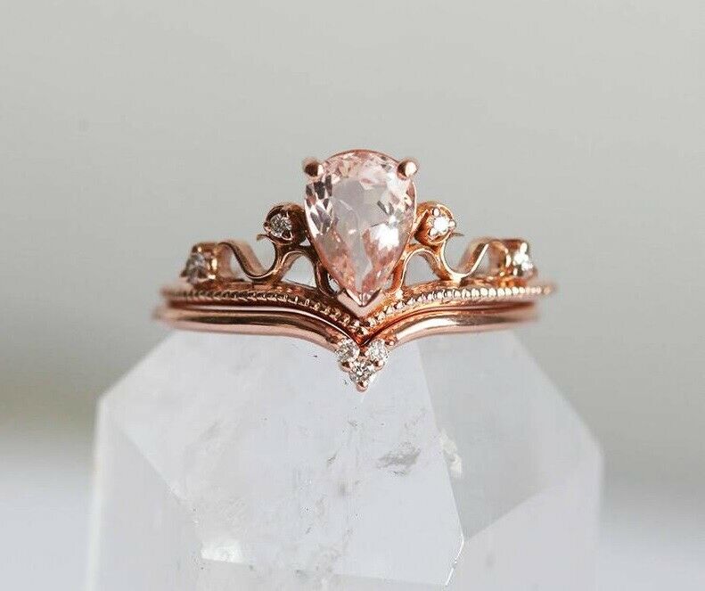 1.5ct Pear Cut Peach Morganite Crown Tiara Bridal Set Ring 14k Rose Gold Finish