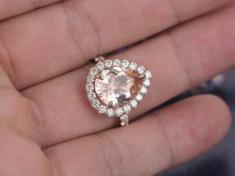 1.5ct Pear Cut Peach Morganite Engagement Ring Diamond Halo 14k Rose Gold Finish