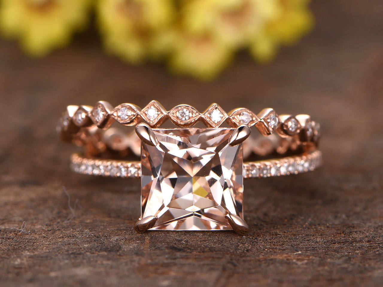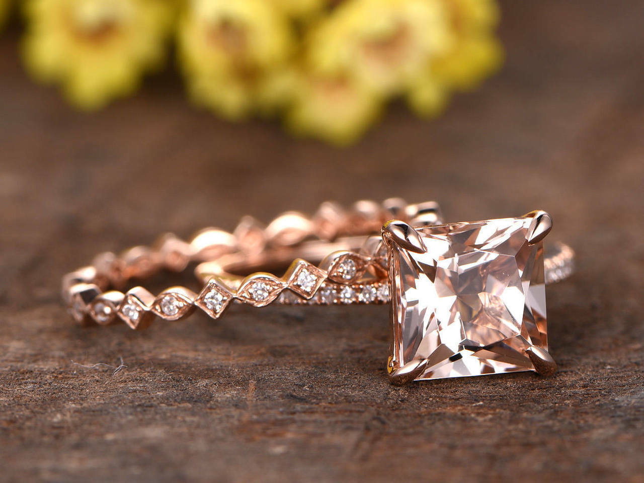 1.5ct Princess Cut Champagne Morganite Bridal Set Ring Band 14k Rose Gold Finish