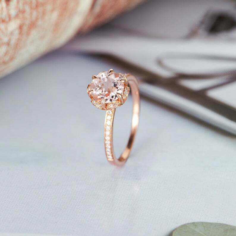 1.5ct Round Cut Morganite Engagement Ring Floral Solitaire 14k Rose Gold Finish