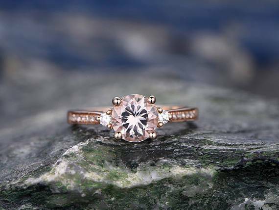 1.5ct Round Cut Peach Morganite Engagement Ring 14k Rose Gold Finish Three Stone