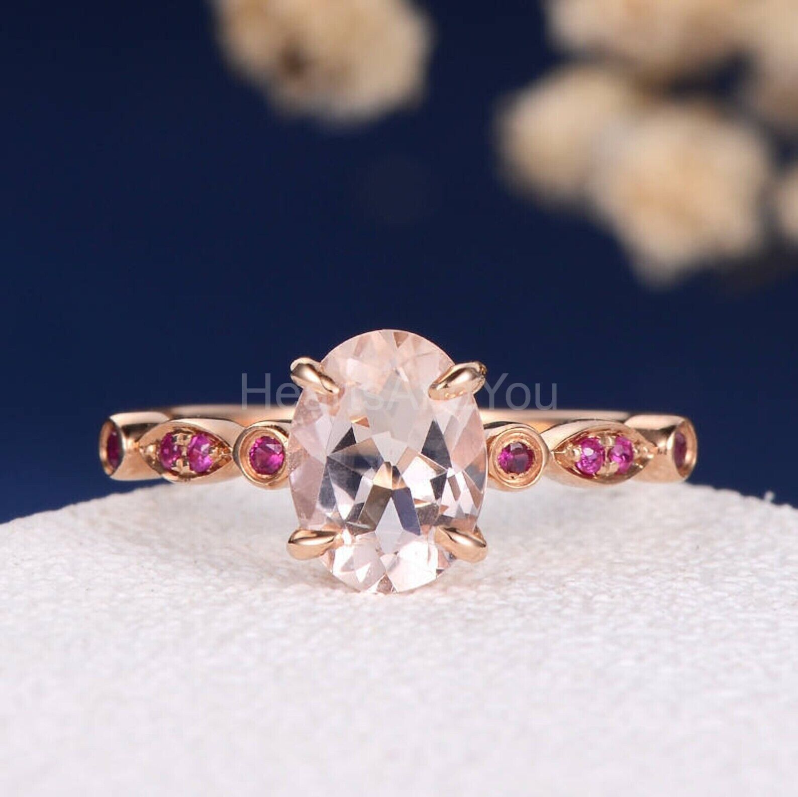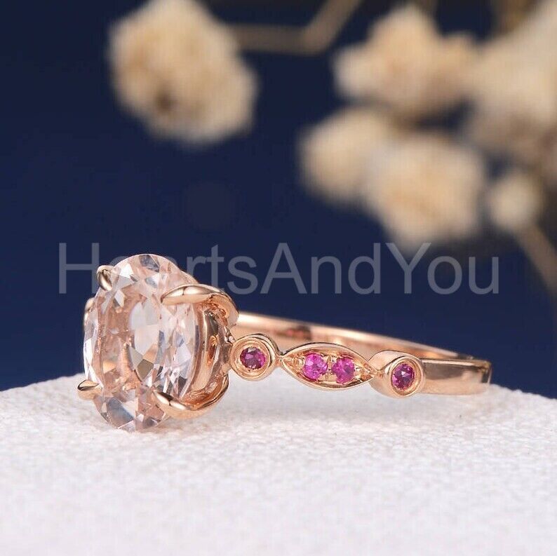 1.6ct Oval Cut Simulated Peach Morganite Accented Ruby Ring 14k Rose Gold Plated
