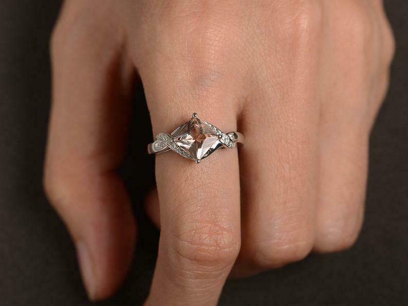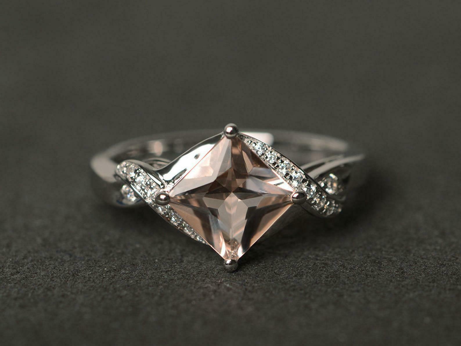 1.6ct Princess Cut Peach Morganite Twisted Solitaire Ring 14k White Gold Finish