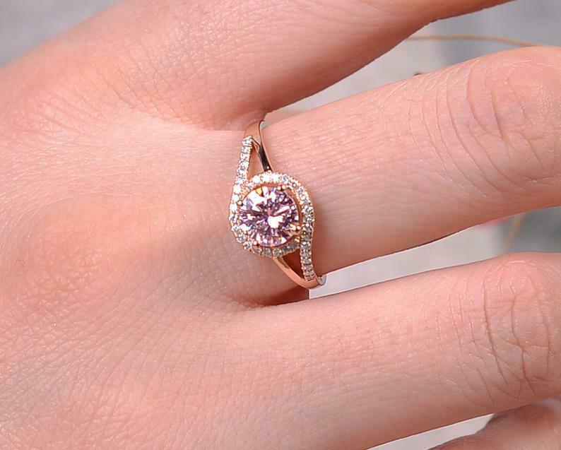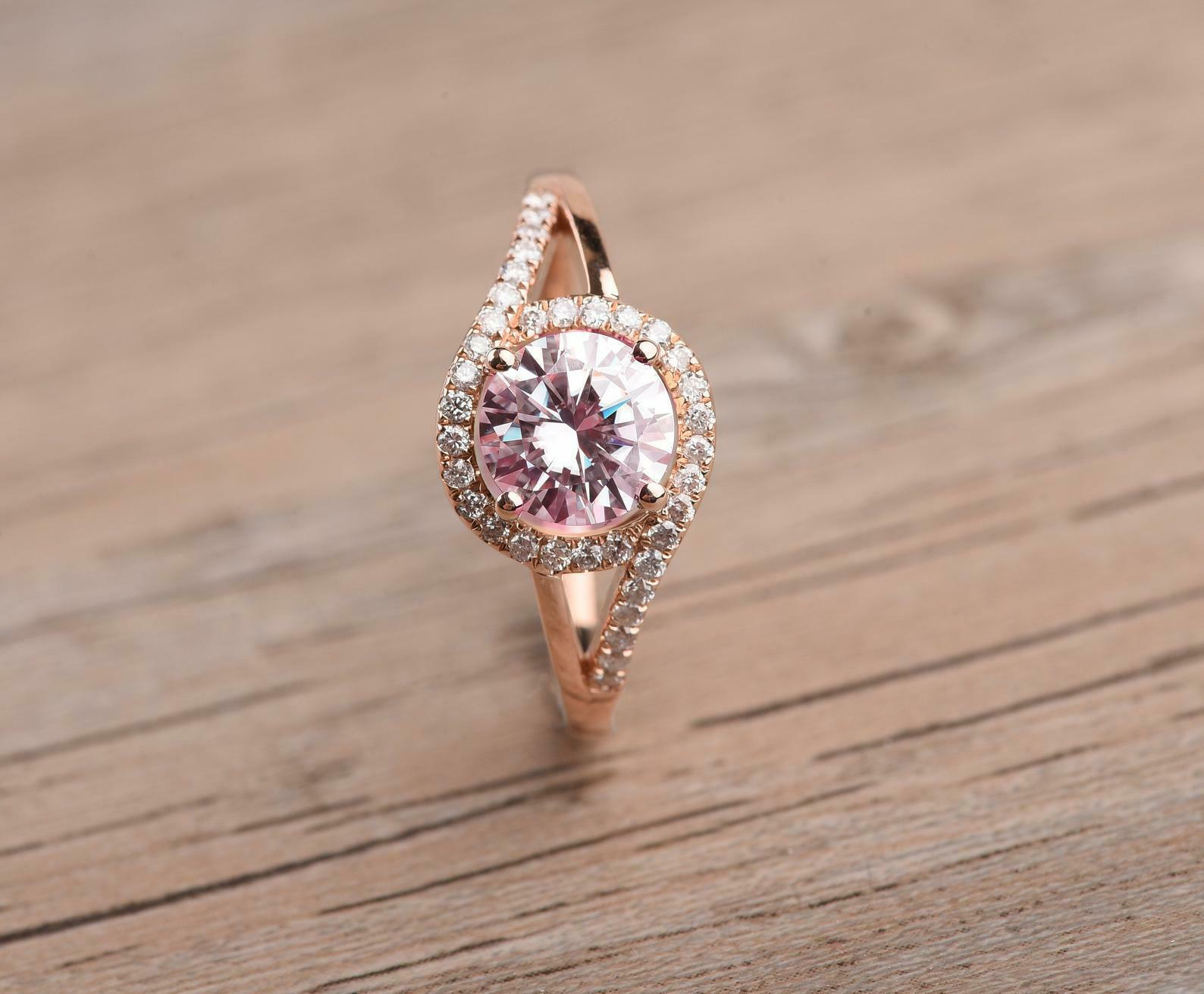 1.7ct Round Cut Peach Morganite Engagement Ring Split Shank Halo 14k Rose Gold Finish