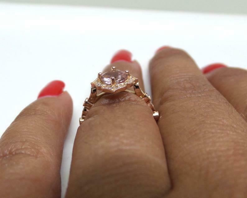 1.9ct Engagement Ring Cushion Cut Morganite Milgrain Floral 14k Rose Gold Finish