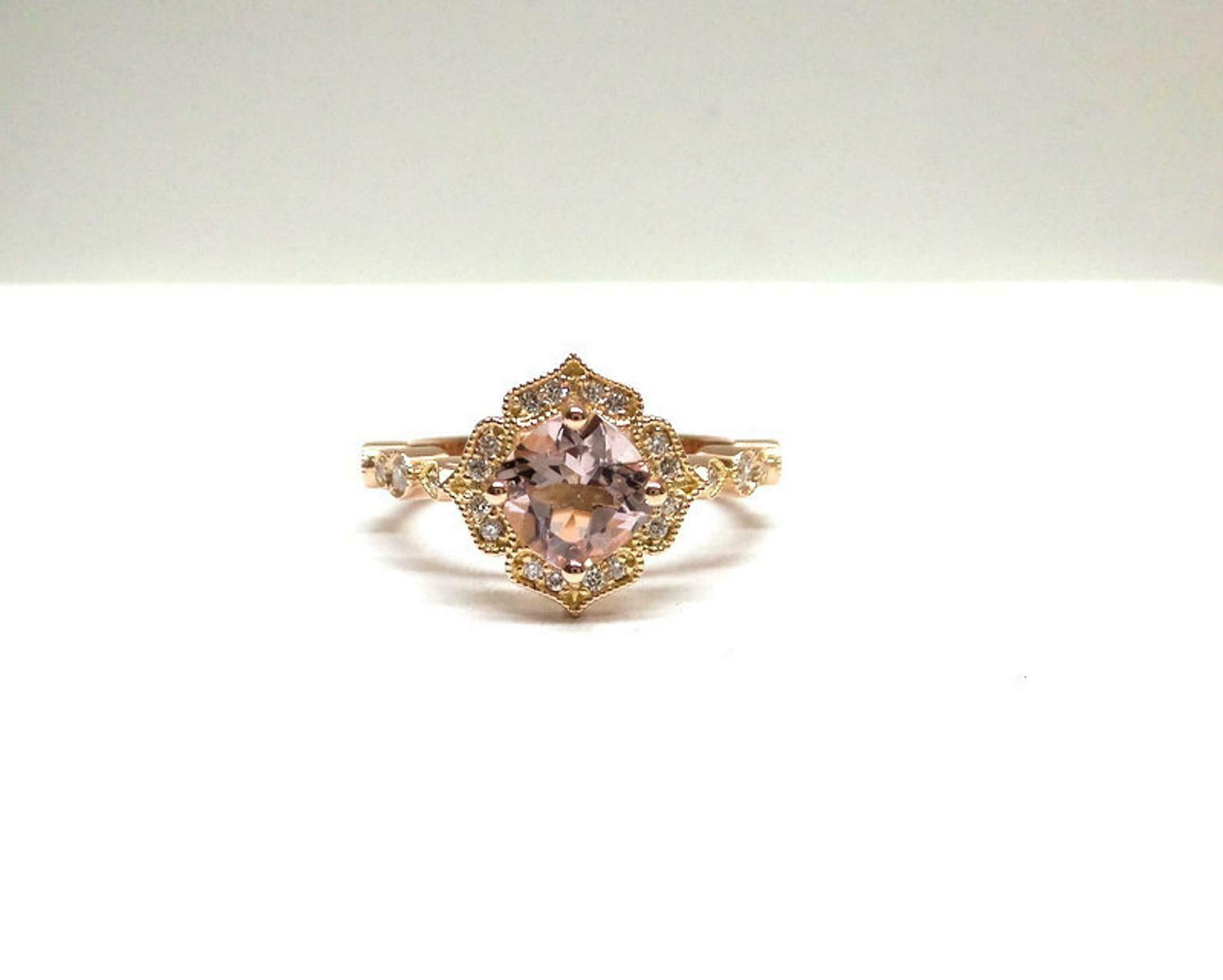 1.9ct Engagement Ring Cushion Cut Peach Morganite Milgrain Floral 14k Rose Gold Finish
