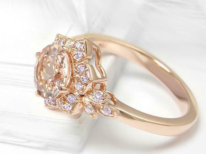 1.9ct Engagement Ring Round Cut Peach Morganite Floral 14k Rose Gold Finish