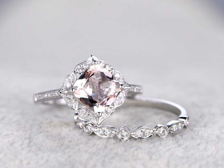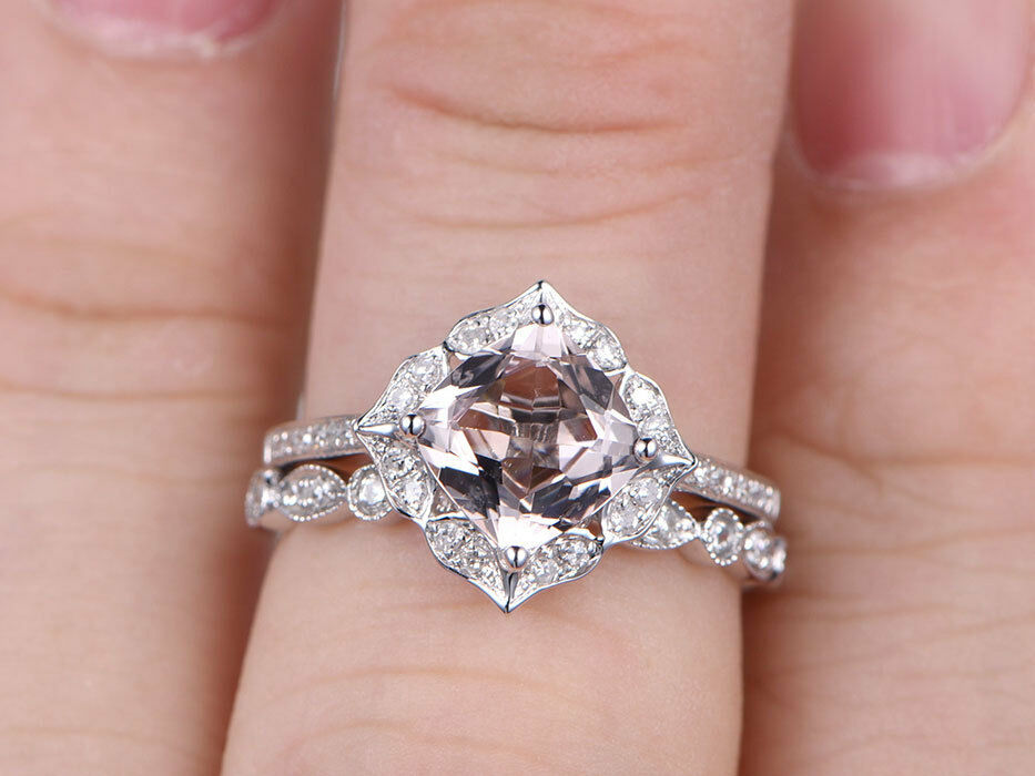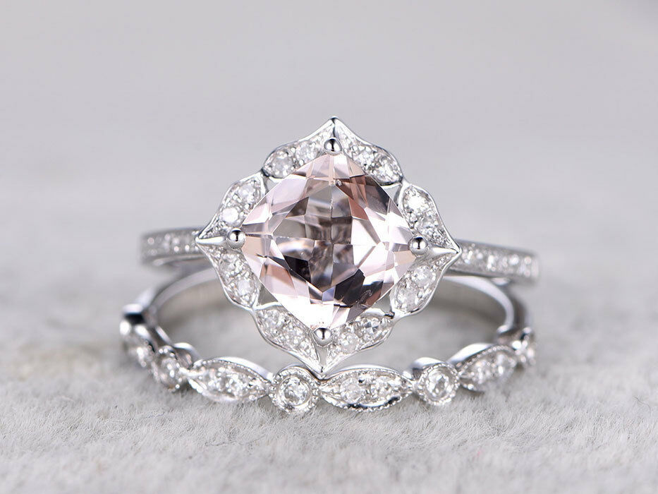 1ct Cushion Cut Morganite Bridal Wedding Set Engagement 14k White Gold Finish