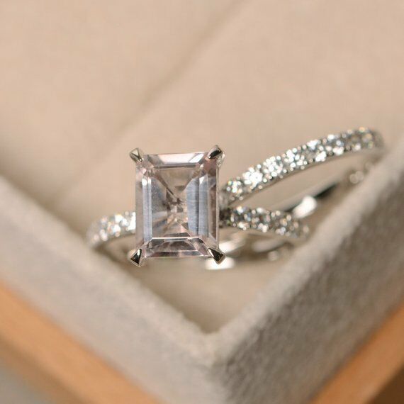 1ct Emerald Cut Champagne Morganite Bridal Set Ring Band 14k White Gold Finish