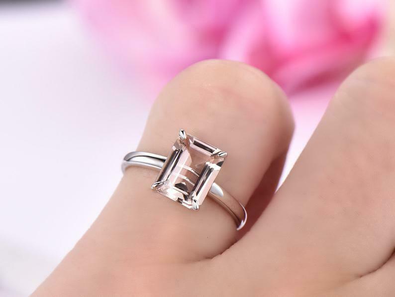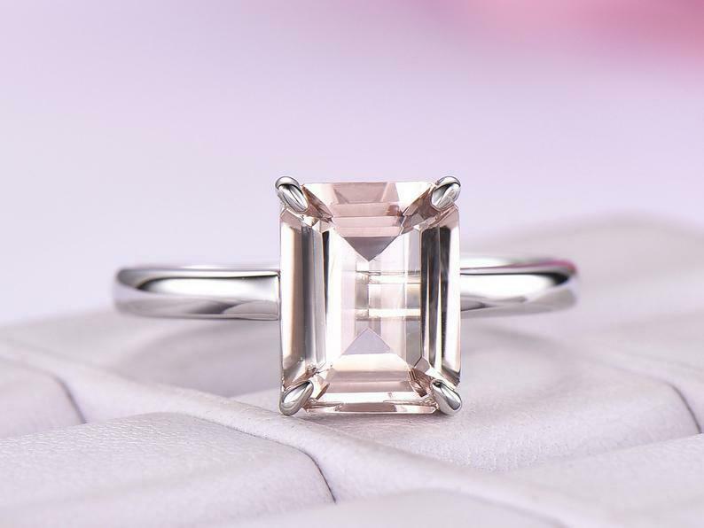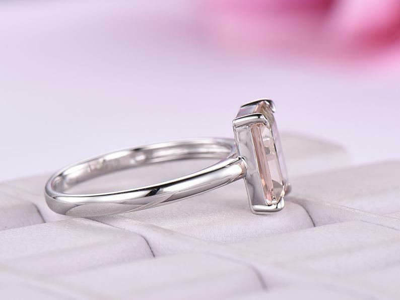1ct Emerald Cut Peach Morganite Engagement Ring Solitaire 14k White Gold Finish