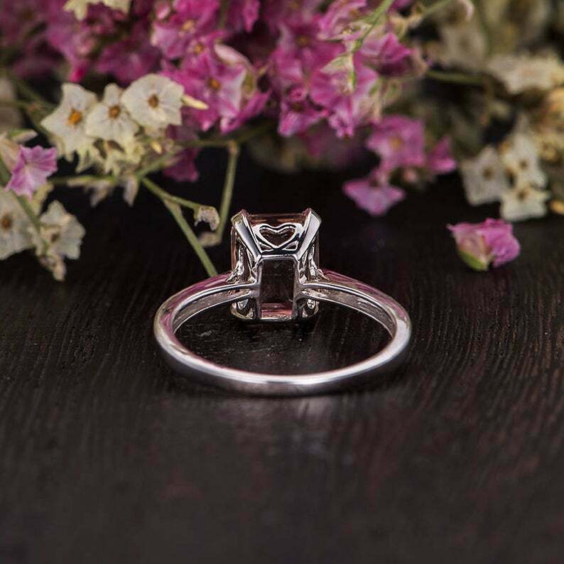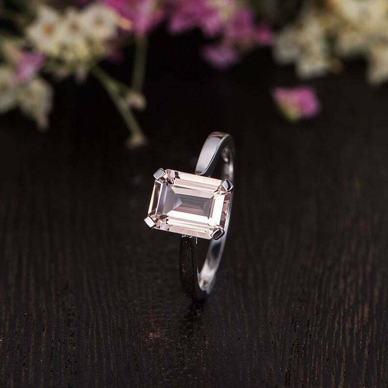 1ct Emerald Cut Peach Morganite Solitaire Engagement Ring 14k White Gold Finish