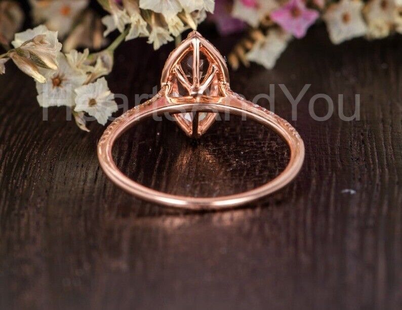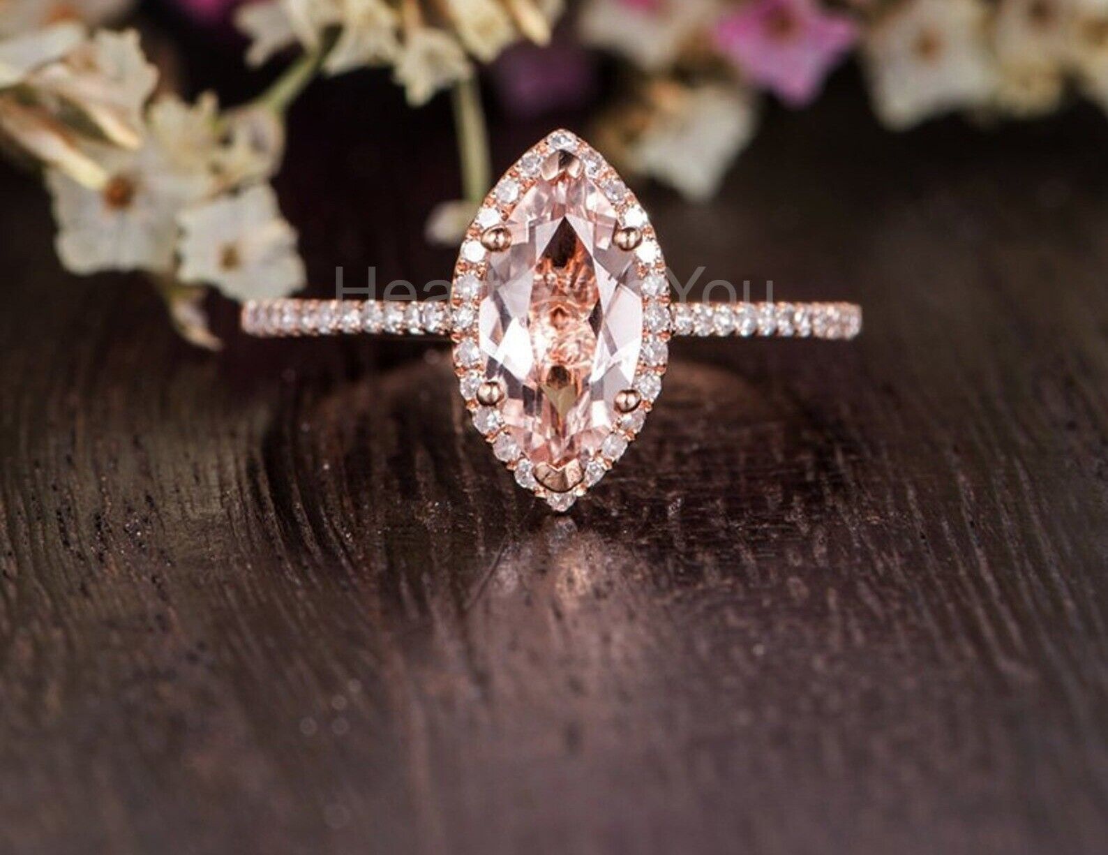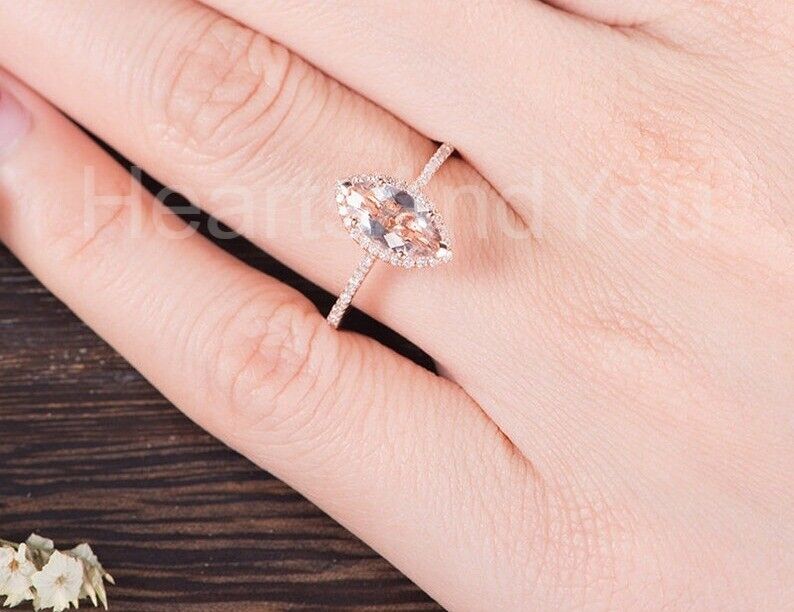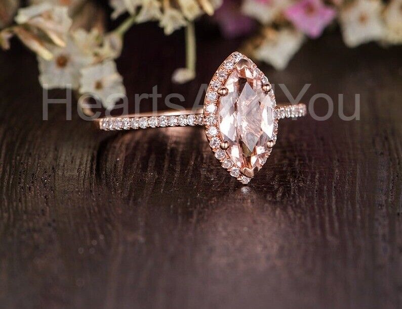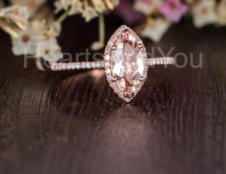 1ct Marquise Cut Simulated Peach Morganite Halo Engagement Ring 14k White Gold Plated