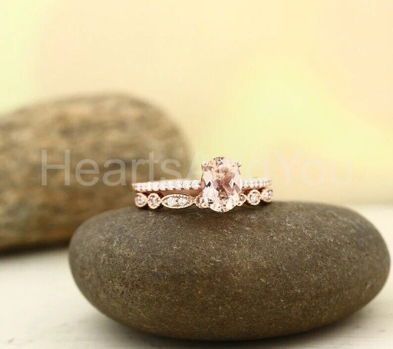 1ct Oval Cut Simulated Peach Morganite Half Eternity Bridal Set 14k Rose Gold Plated