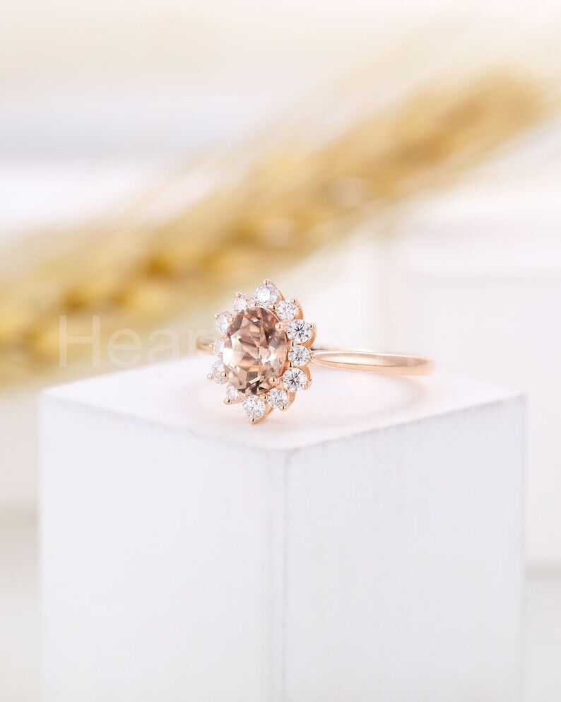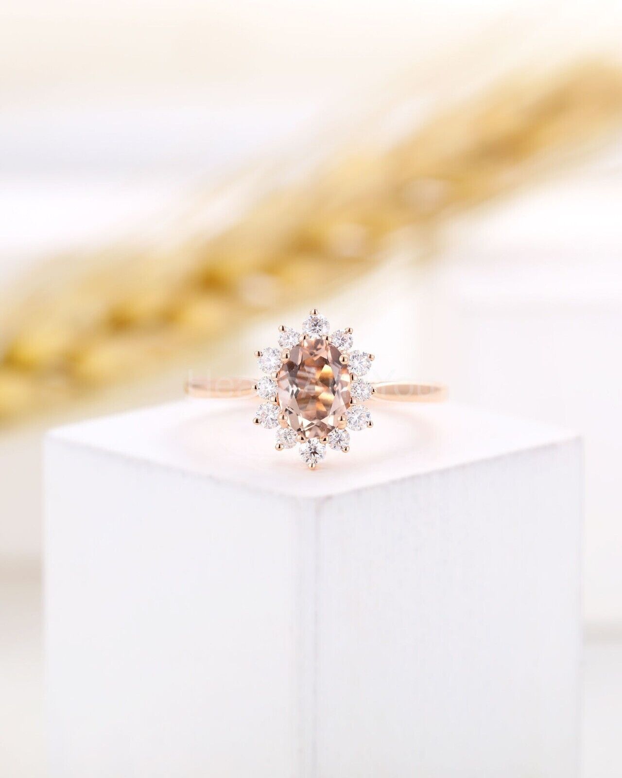 1ct Oval Cut Simulated Peach Morganite Halo Engagement Ring 14k Rose Gold Plated
