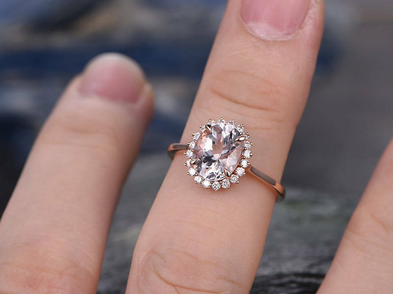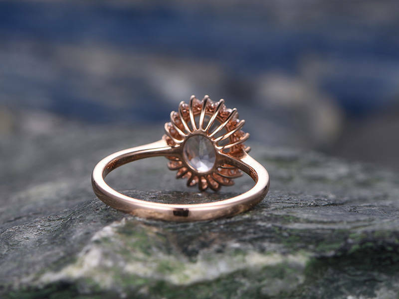 1Ct Oval Peach Morganite Floral Diamond Halo Engagement Ring 14K Rose Gold Over