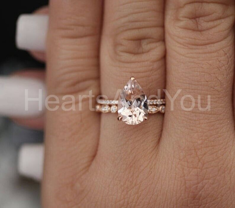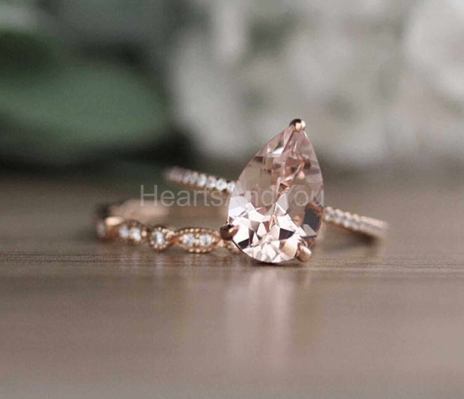 1ct Pear Cut Simulated Peach Morganite Milgrain Bridal Set 14k Rose Gold Plated