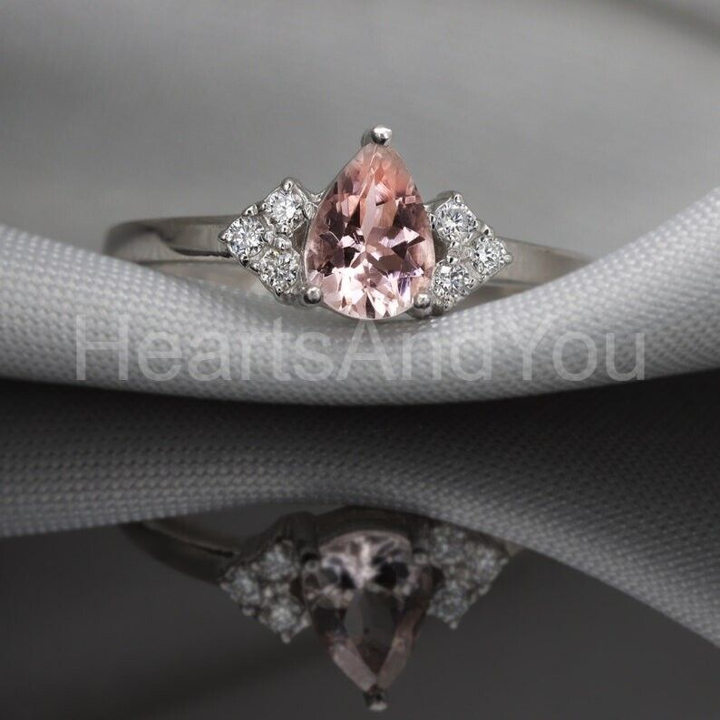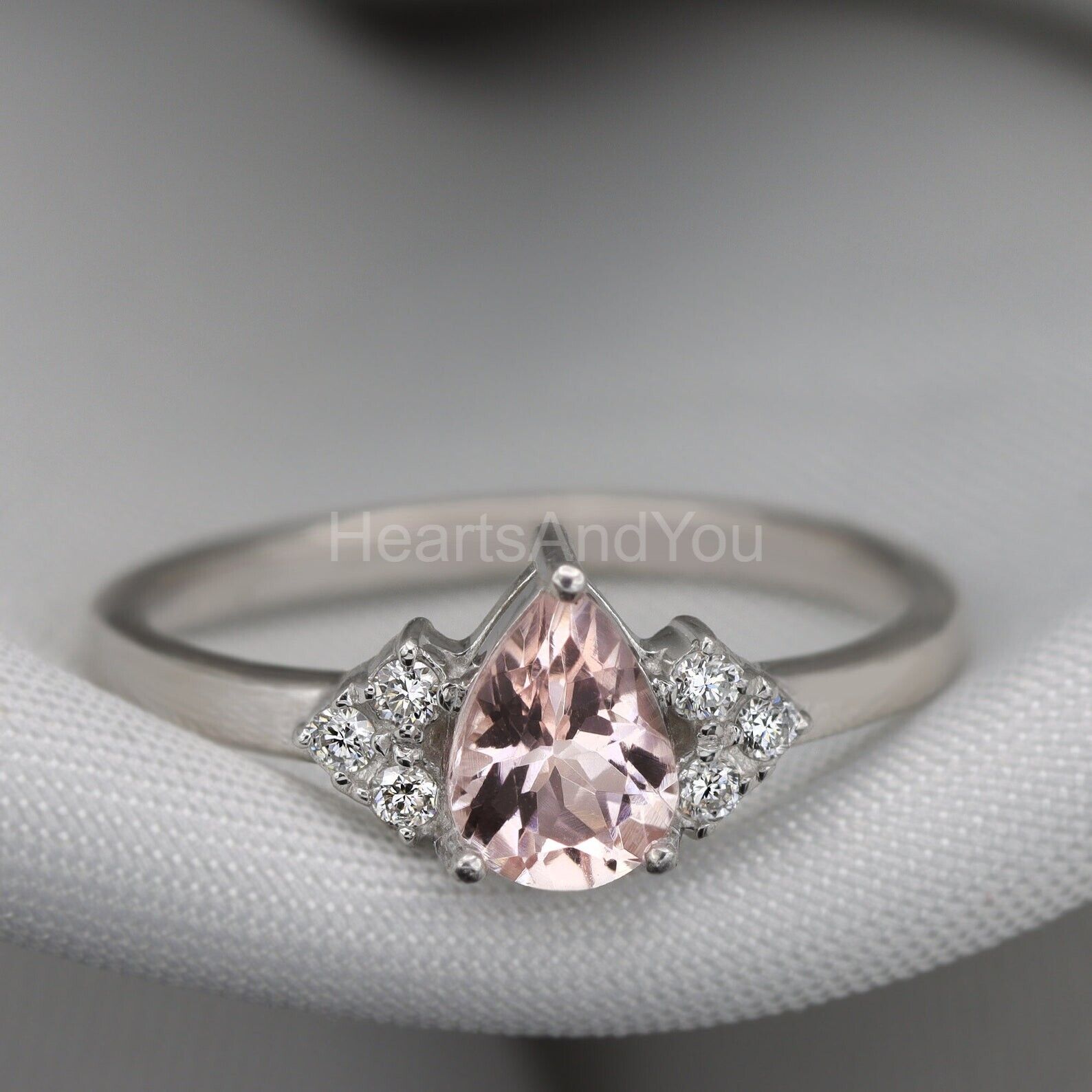 1ct Pear Simulated Morganite Solitaire Round Accents Ring 14k White Gold Plated