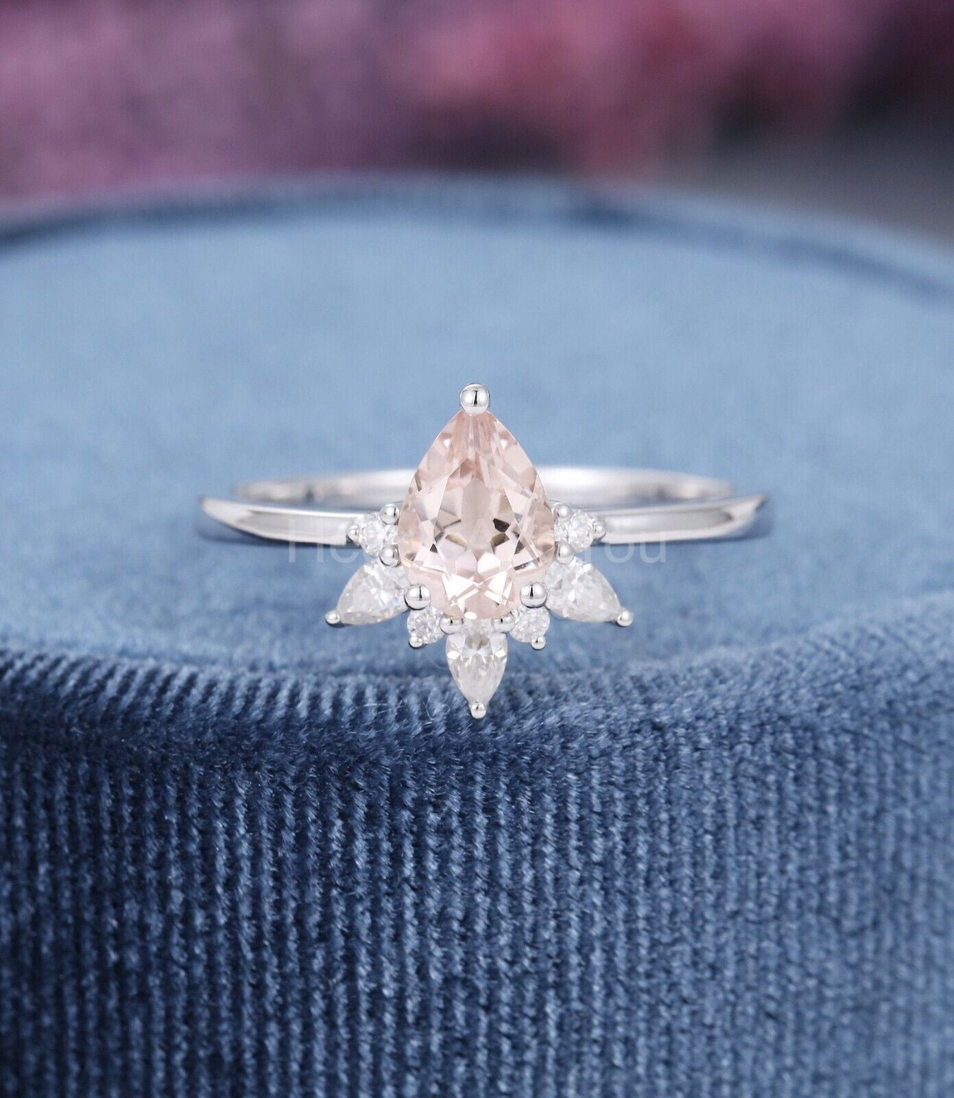 1ct Pear Simulated Peach Morganite Crown Engagement Ring 14k White Gold Plated