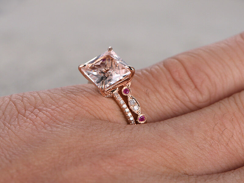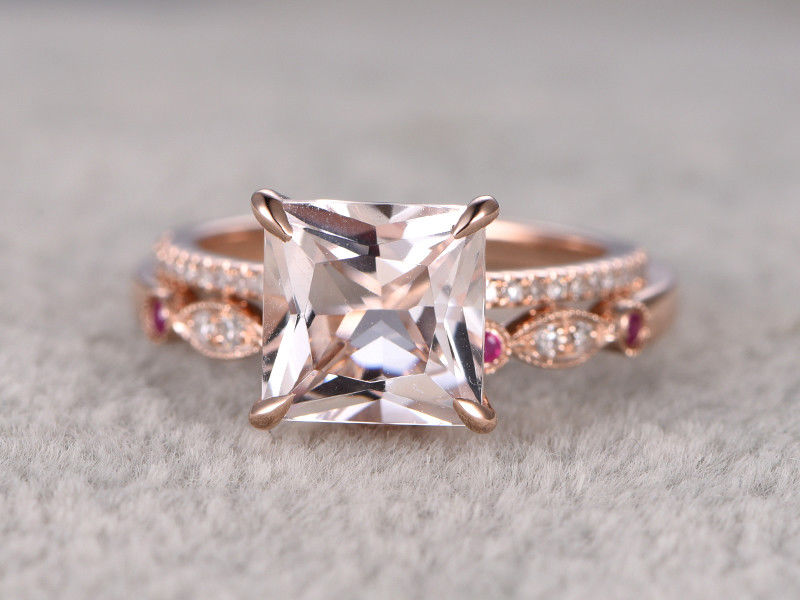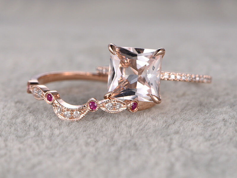 1ct Princess Cut Champagne Morganite Bridal Set Ring Band 14k Rose Gold Finish