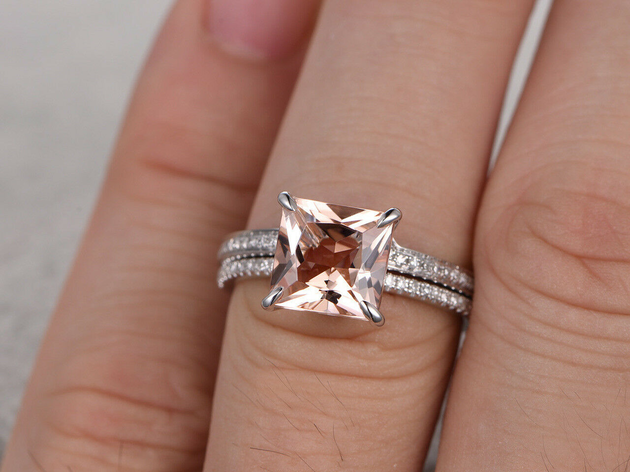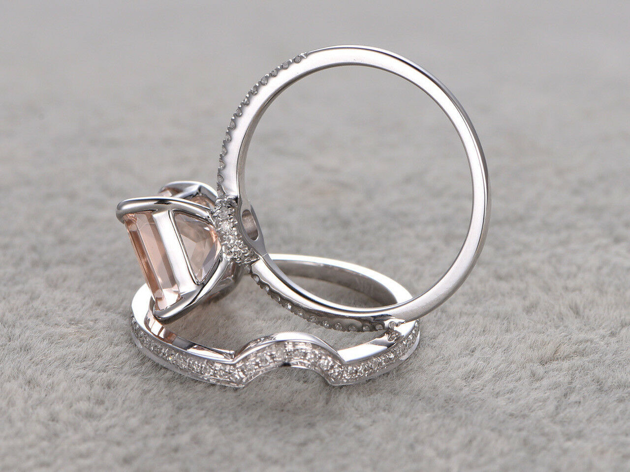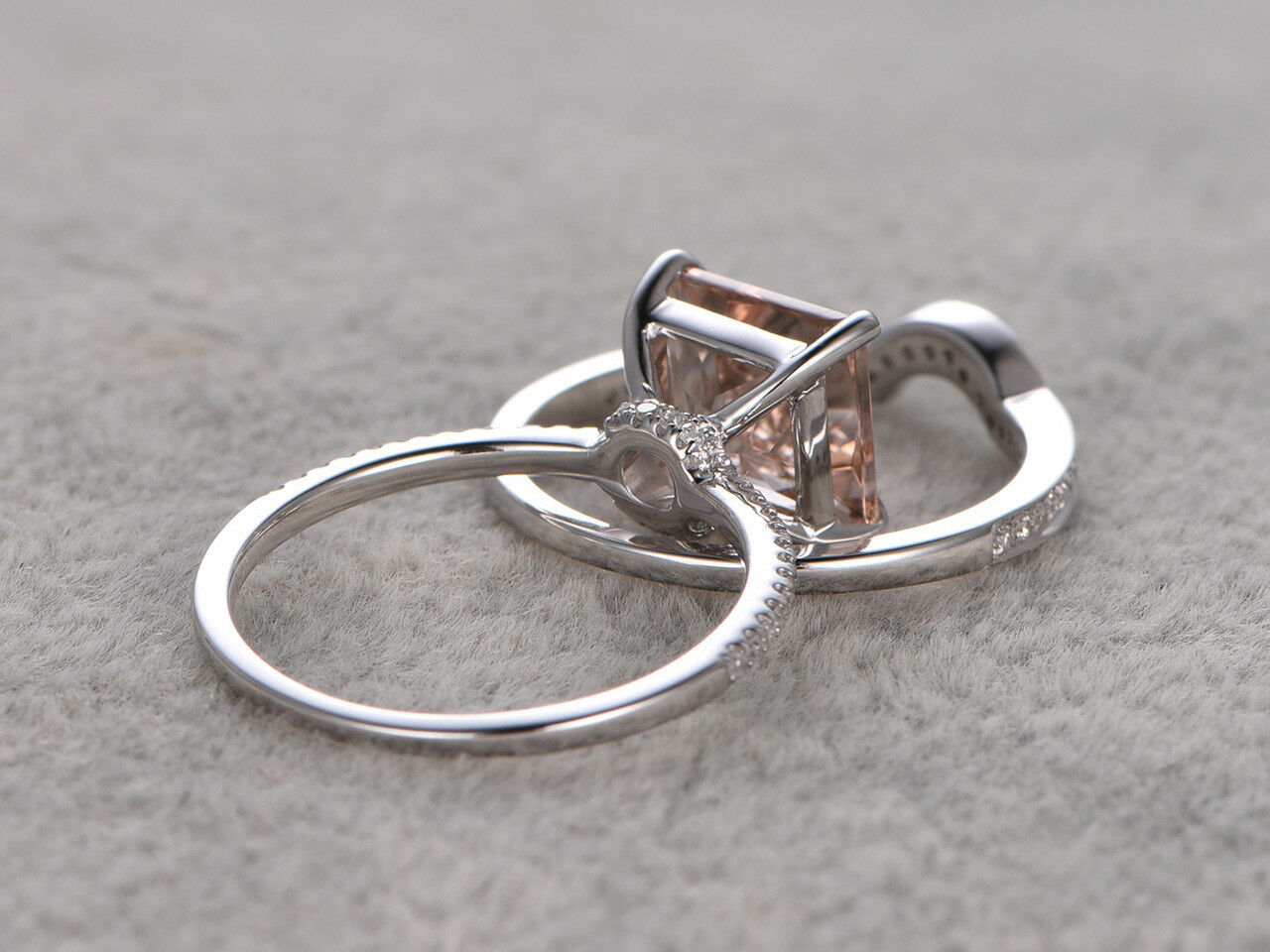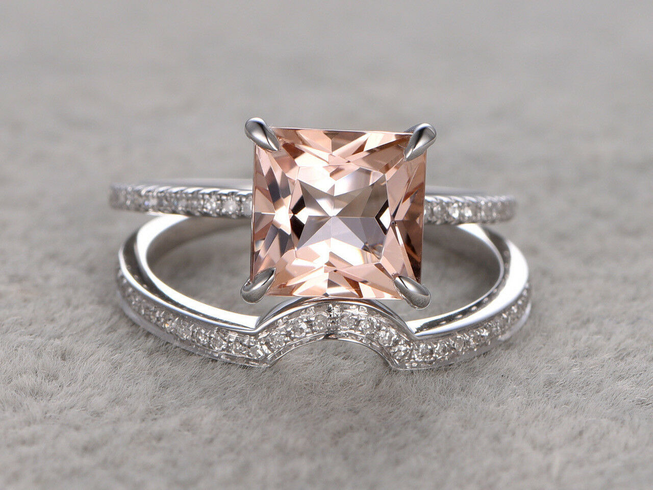 1ct Princess Cut Morganite Bridal Set Engagement Ring Band 14k White Gold Finish