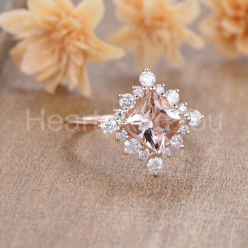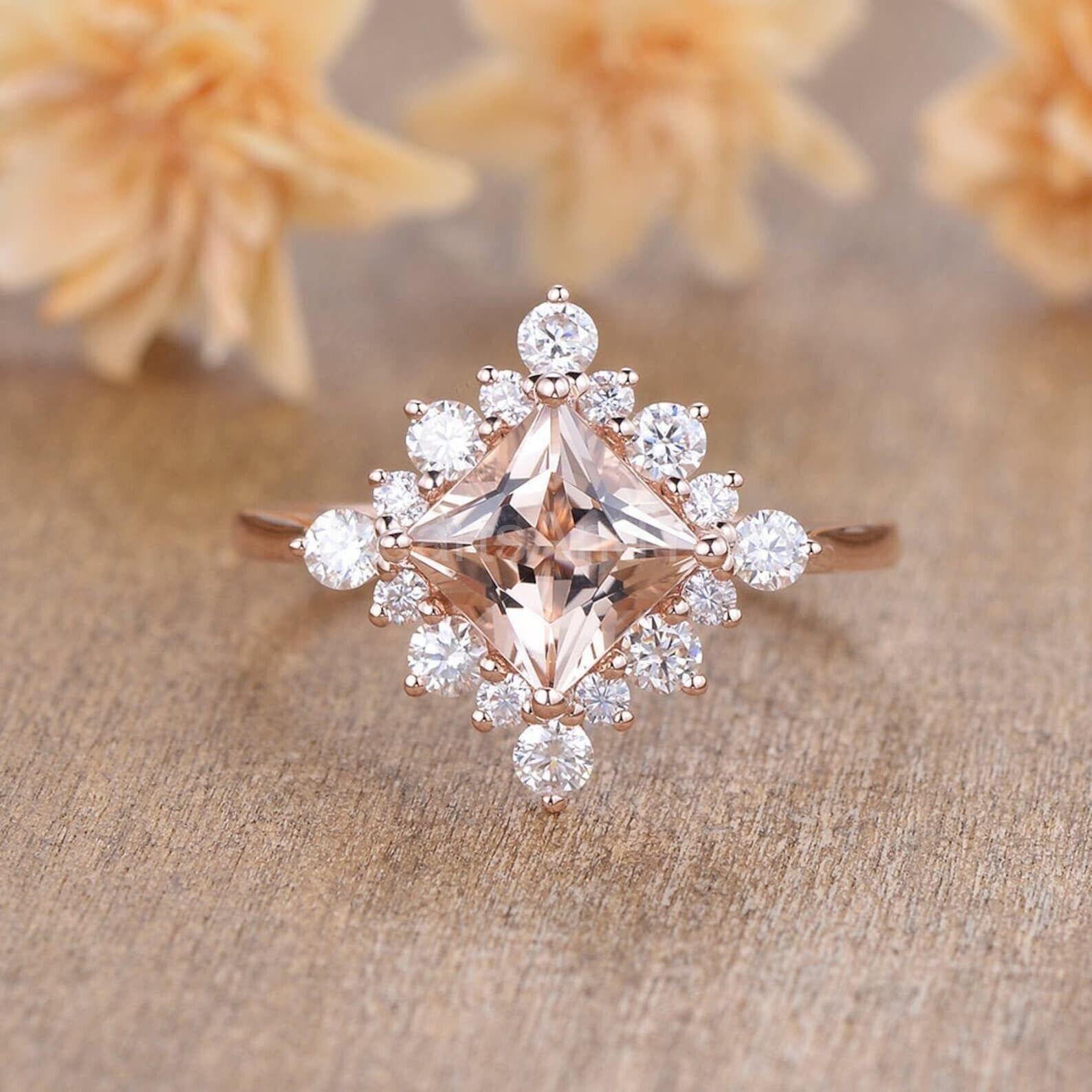 1ct Princess Cut Simulated Morganite Halo Engagement Ring 14k Rose Gold Plated