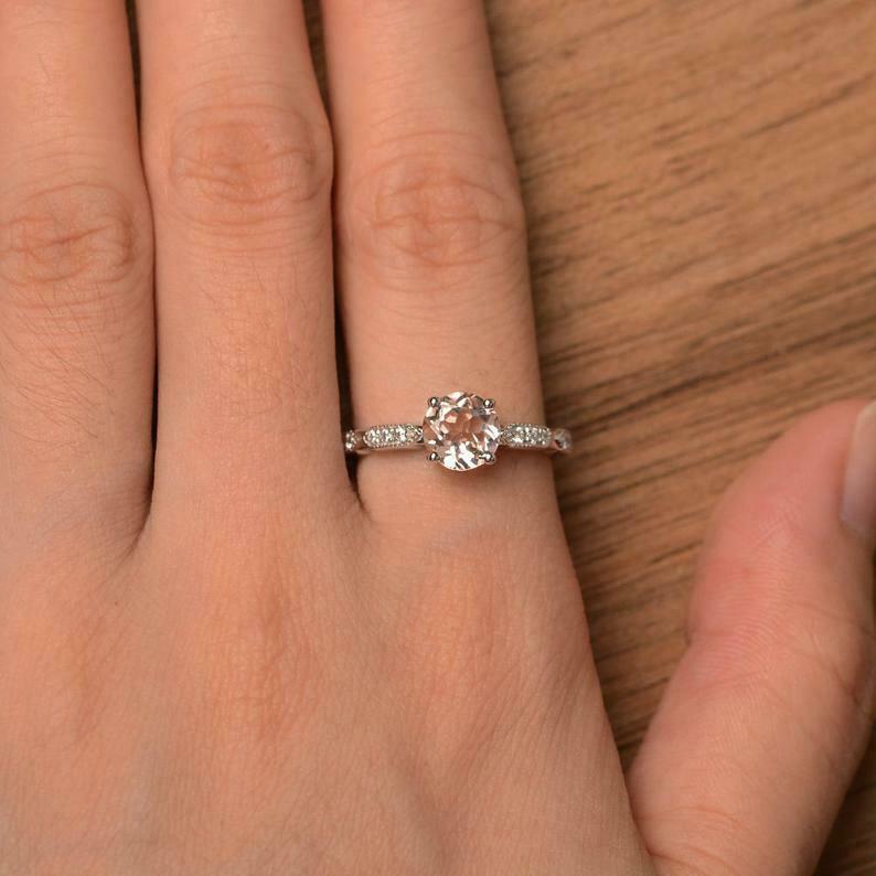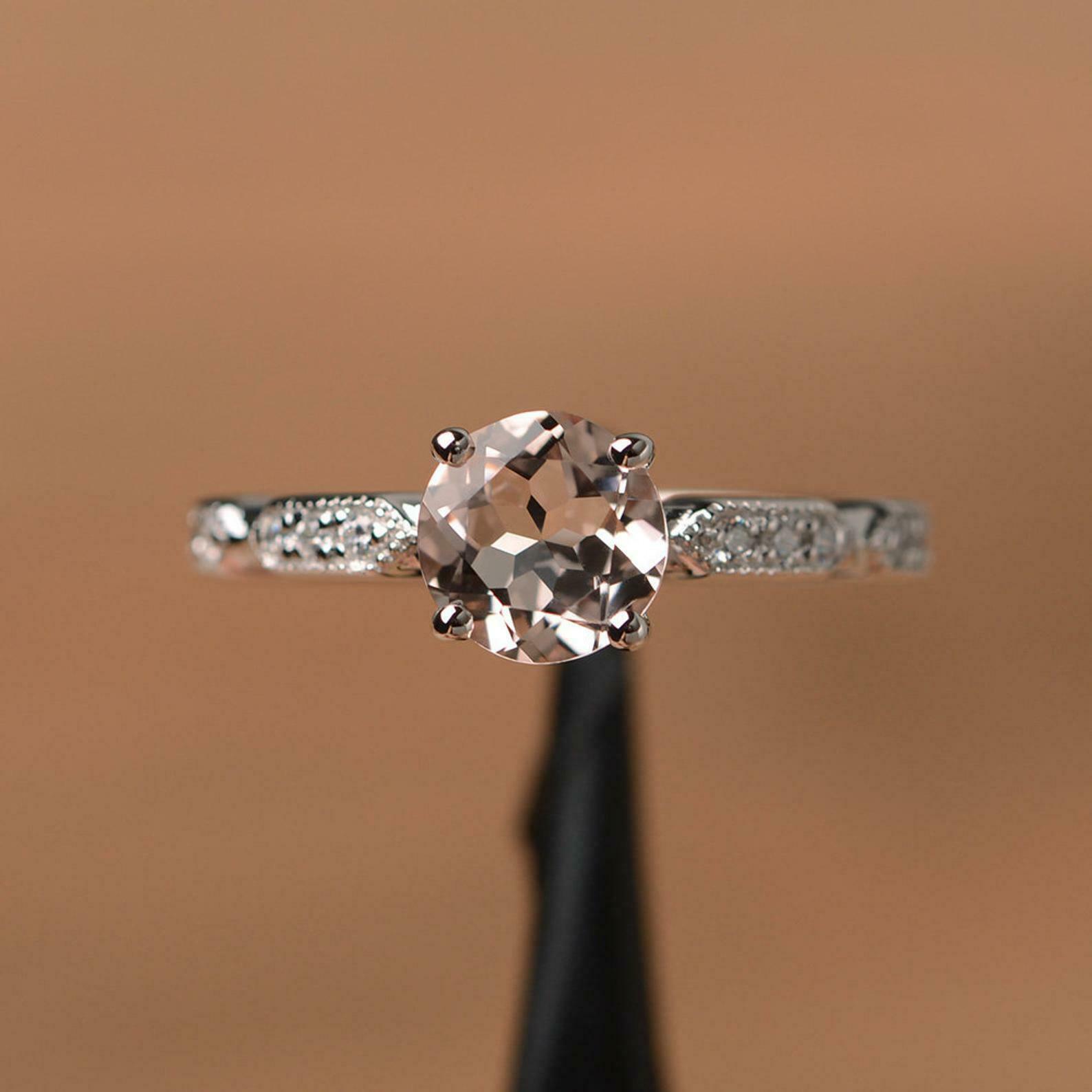 1ct Round Cut Peach Morganite Solitaire with Round Accent Ring 14k White Gold Finish
