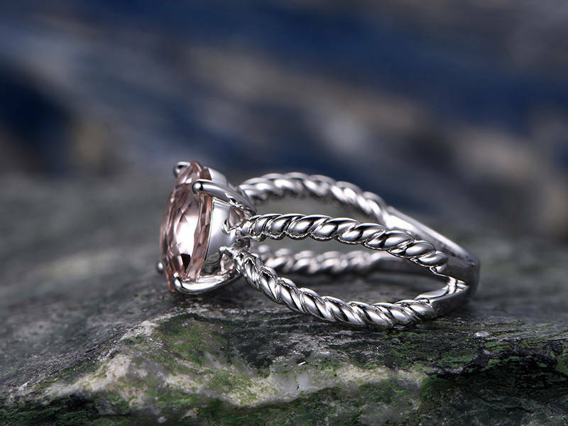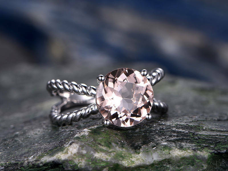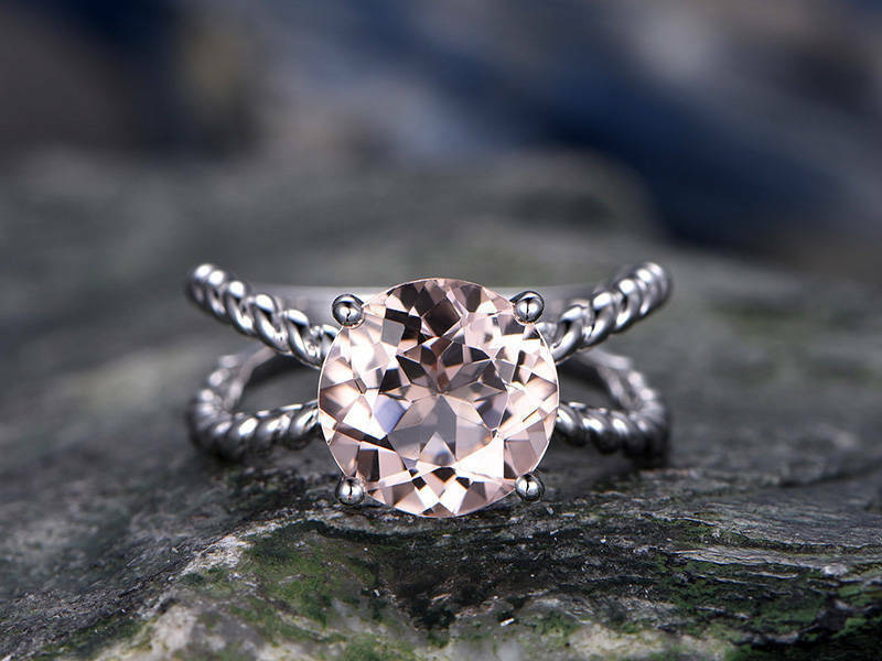 1Ct Round Peach Morganite Rope Split Band Engagement Ring 14K White Gold Finish
