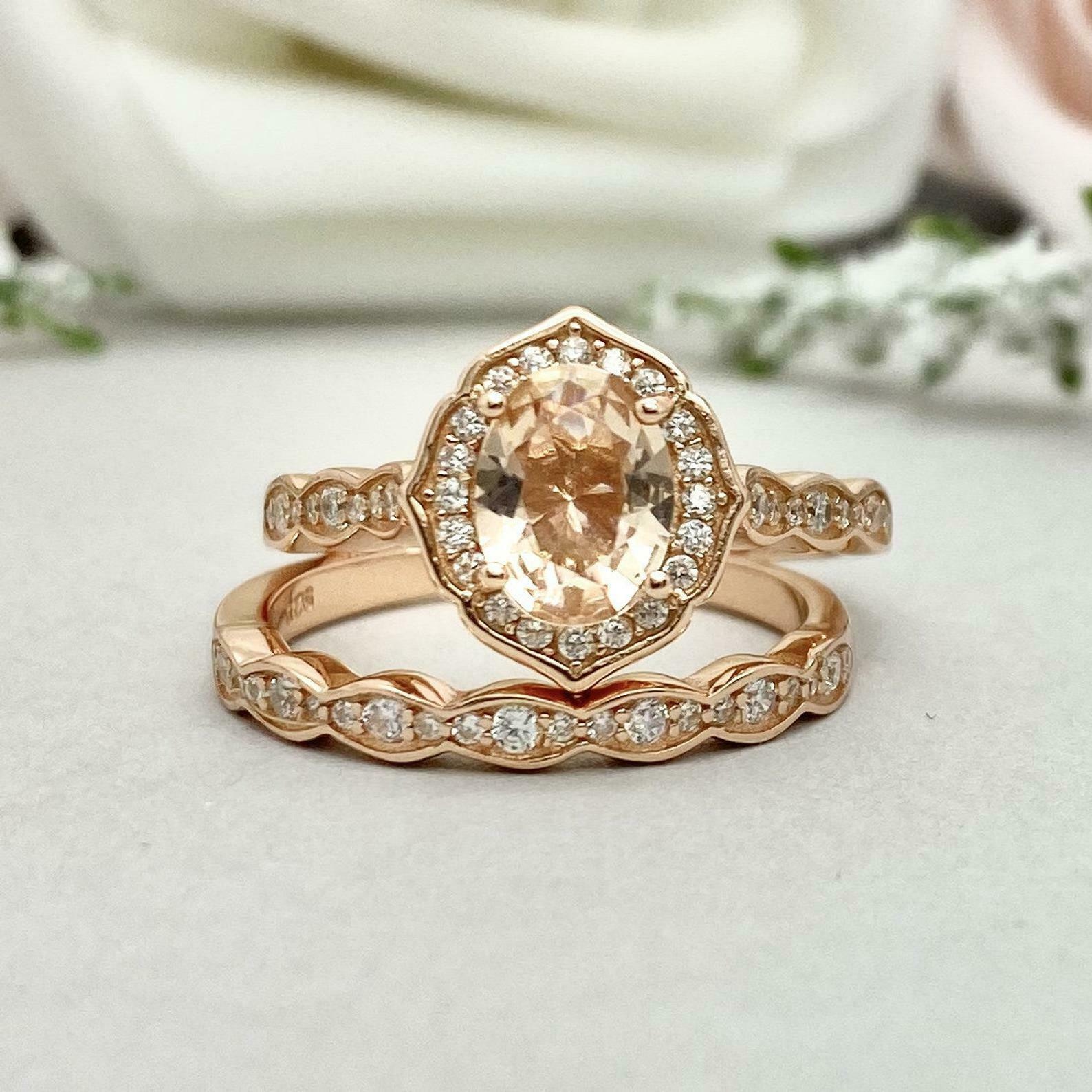 2.1ct Engagement Ring Oval Cut Peach Morganite Bridal Set 14k Yellow Gold Finish