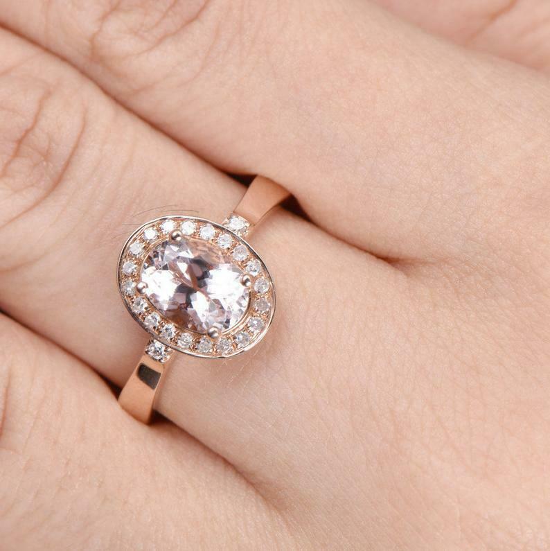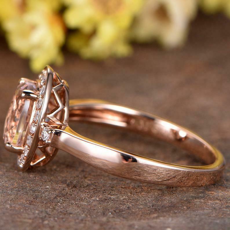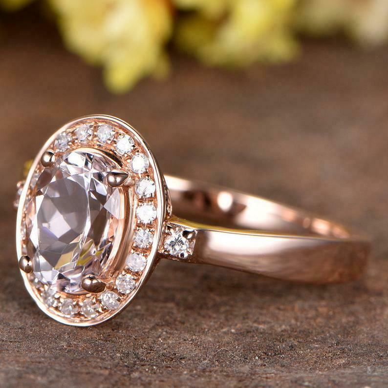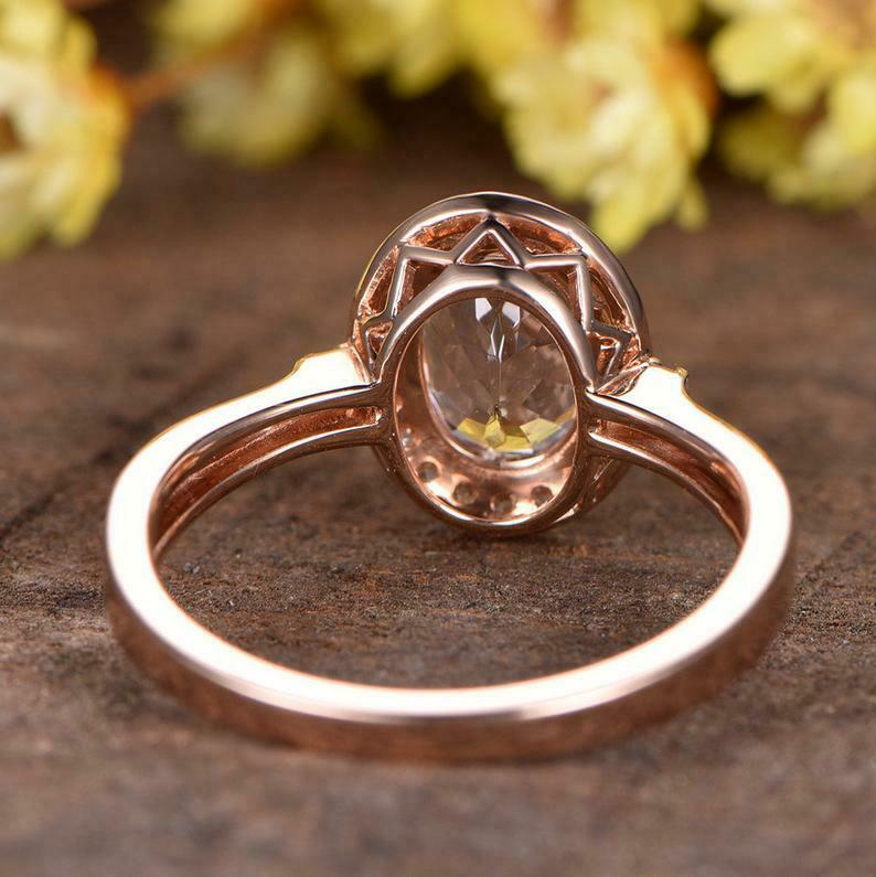 2.1ct Oval Cut Peach Morganite Engagement Ring Halo Trilogy 14k Rose Gold Finish