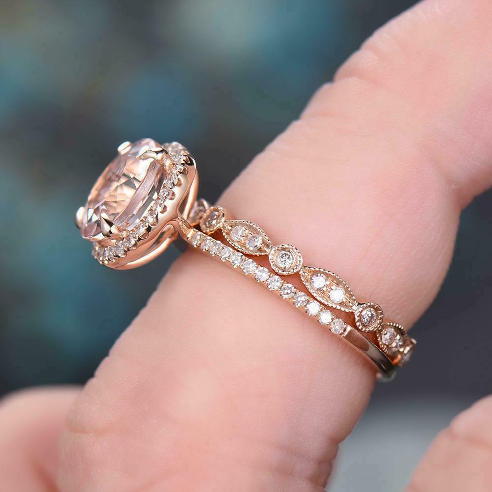 2.1ct Round Peach Morganite Engagement Ring 14k Rose Gold Finish Halo Bridal Set