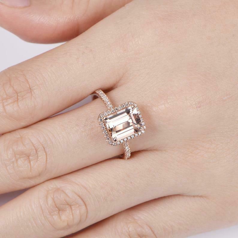 2.2ct Emerald Cut Peach Morganite Halo Ring 14k Rose Gold Over with Round Accents