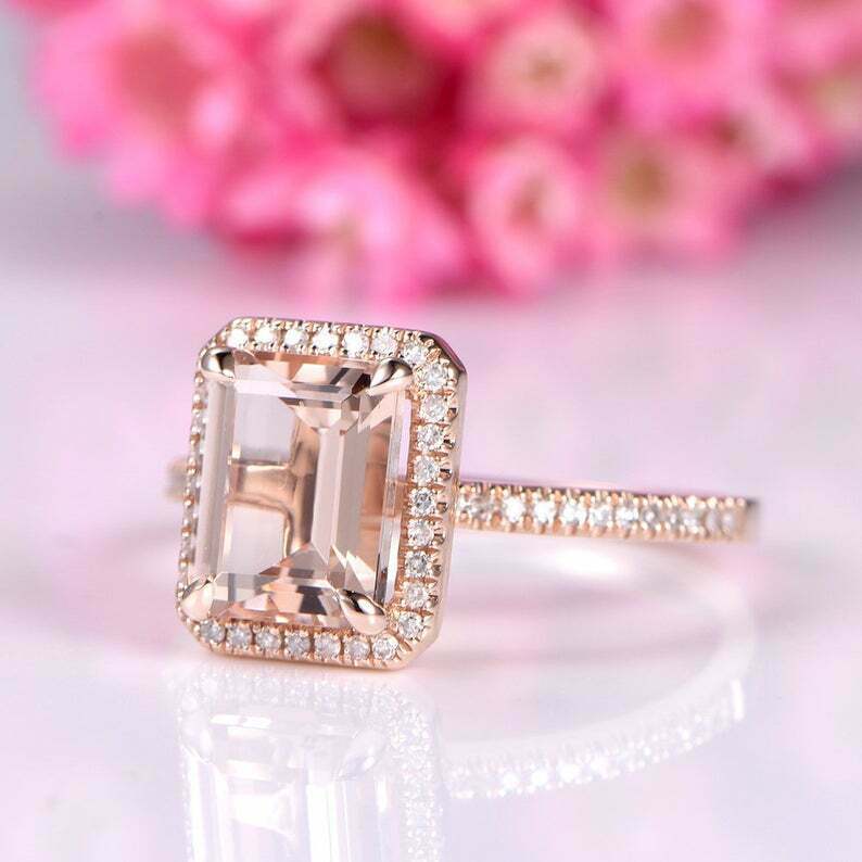 2.2ct Emerald Cut Peach Morganite Halo Ring 14k Rose Gold Over with Round Accent