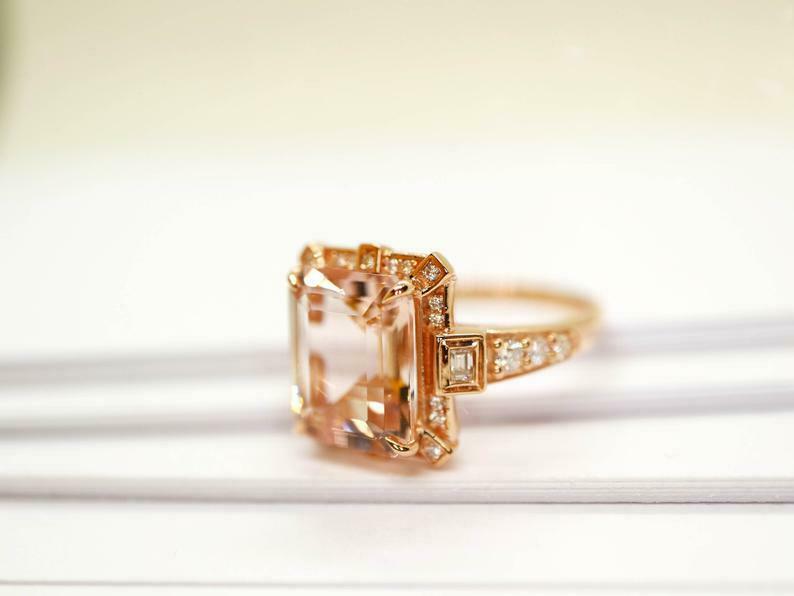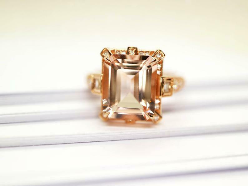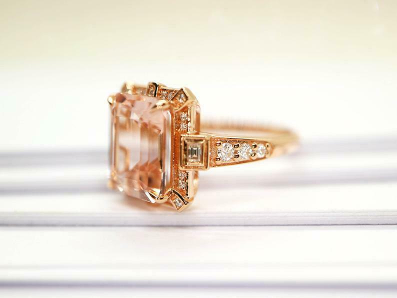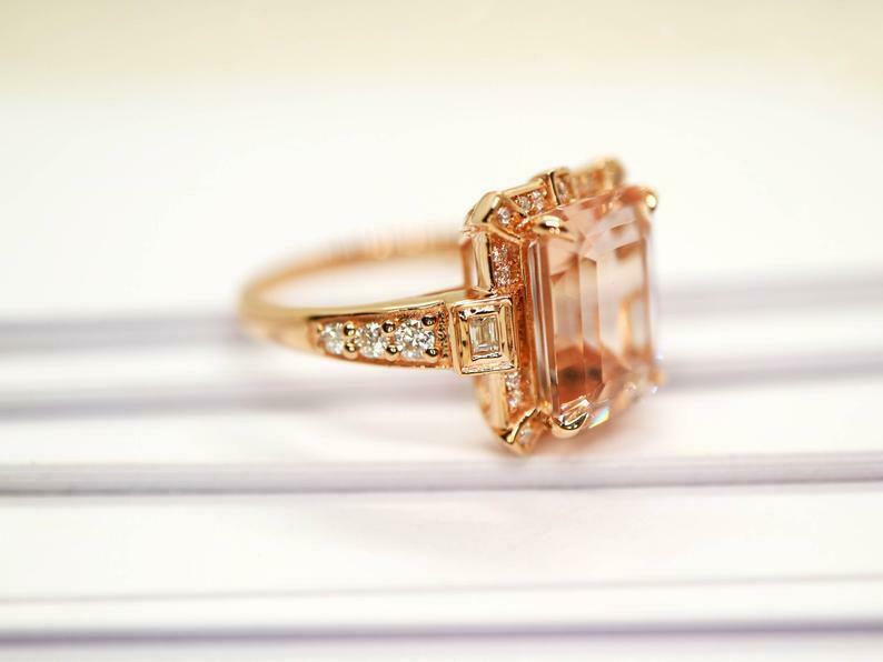 2.2ct Engagement Ring Emerald Cut Peach Morganite Halo 14k Rose Gold Finish